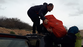 Before we left we sat together as Shvil team. We read Psalm 84 and prayed. Next to other things we prayed for a Jeep that would bring us from the entrance of the Natural reserve to Ein Akev a water pool with a constant water provision. Why did we pray like this, because we were lacking time, it was already midday and 27km of hiking were impossible for us until evening. So we went into the Park and just behind the entrance I stopped a Jeep. Ofek and Shoval were unbeliefably friendly. We put our backpacks on the roof of the car, and squeezed into the Jeep. We had a great conversation during the nearly 40 minutes ride. It was also Ofeks birthday and both of them expressed their gratitude how great it was to have us. But they really were this big blessing for us. As it was Ofeks birthday we prayed for him and blessed him and I invited this two wonderful people to visit us in our home.